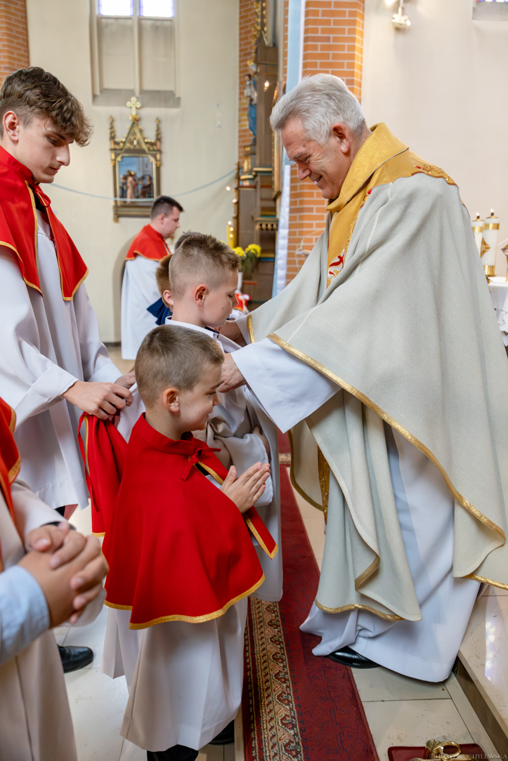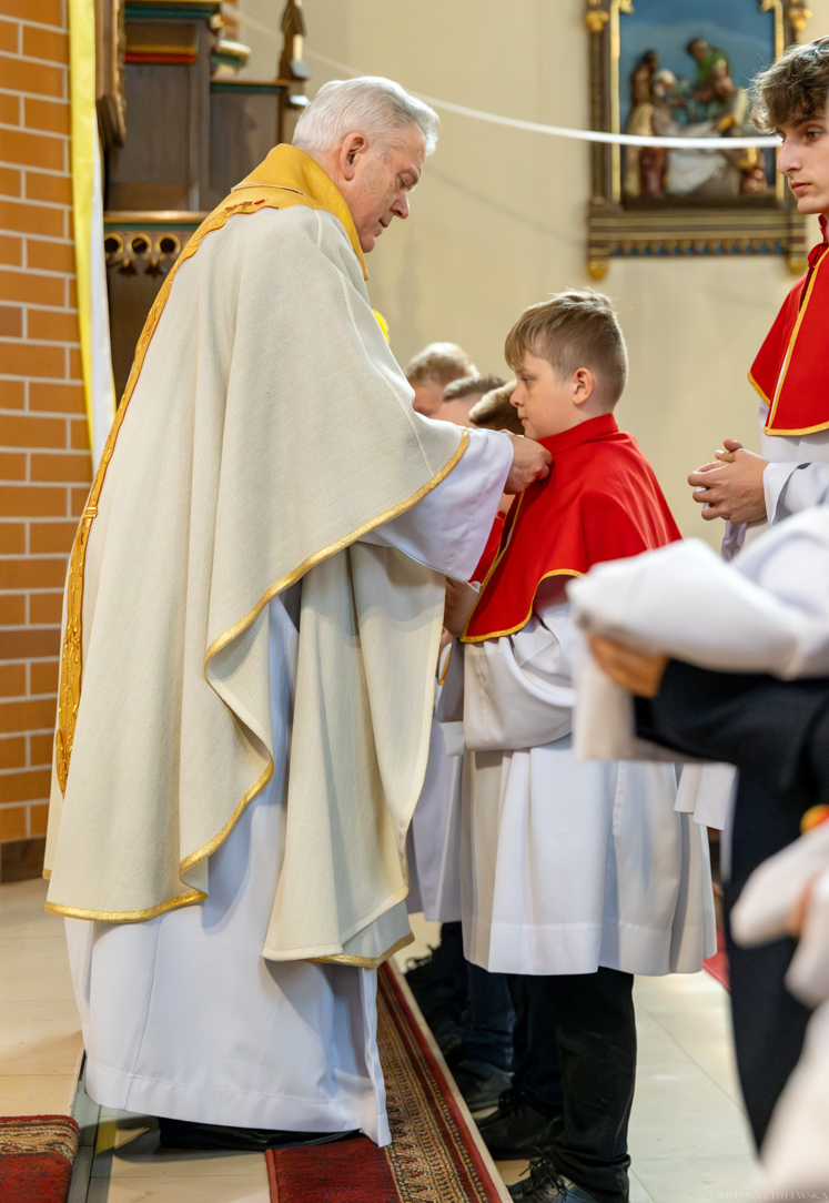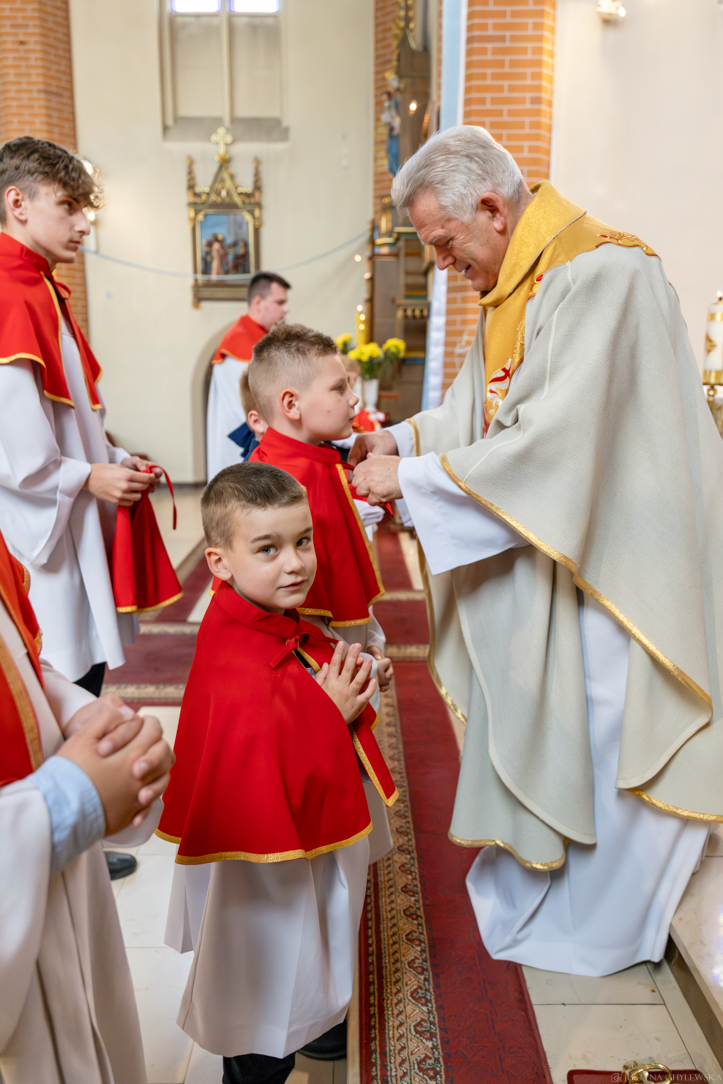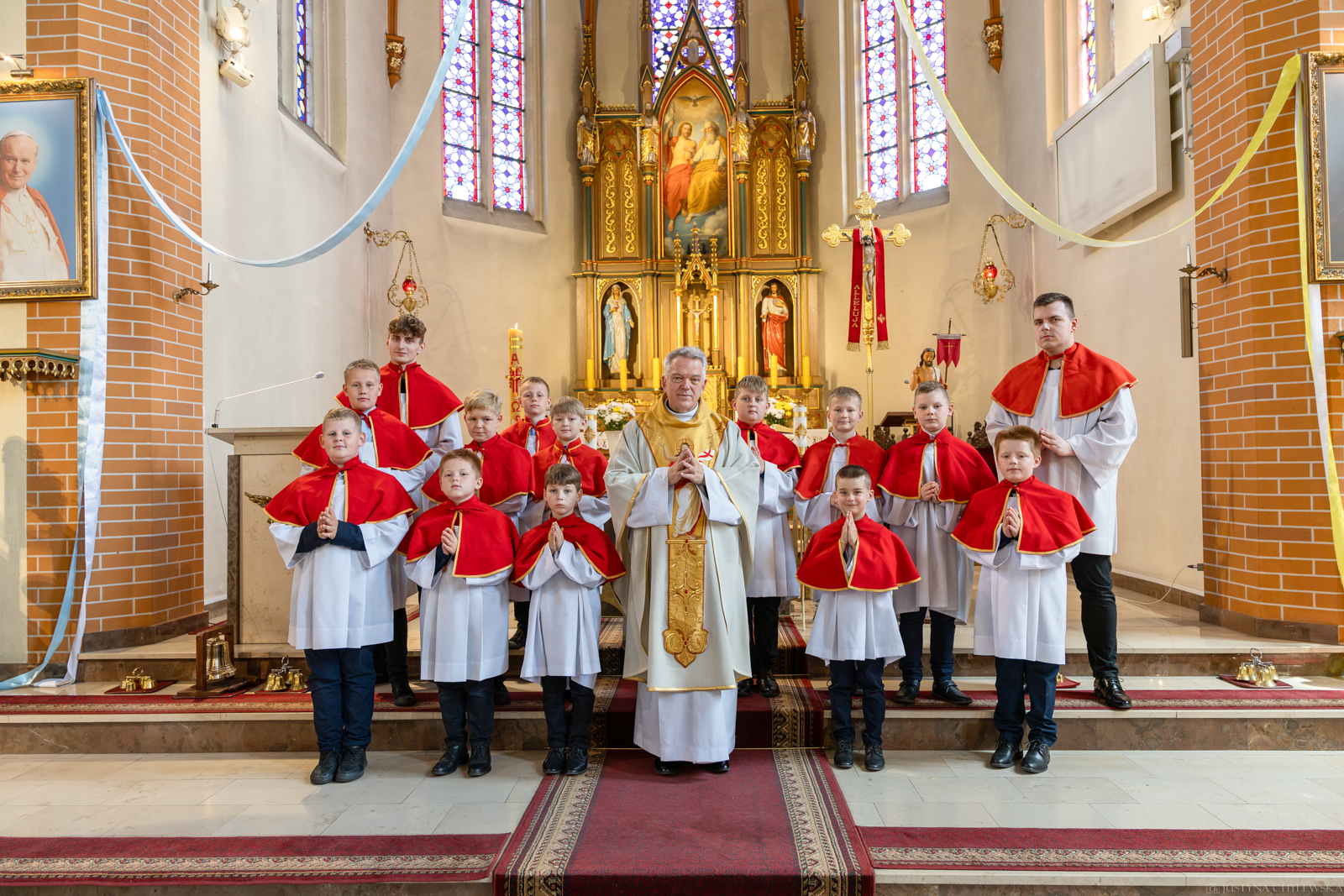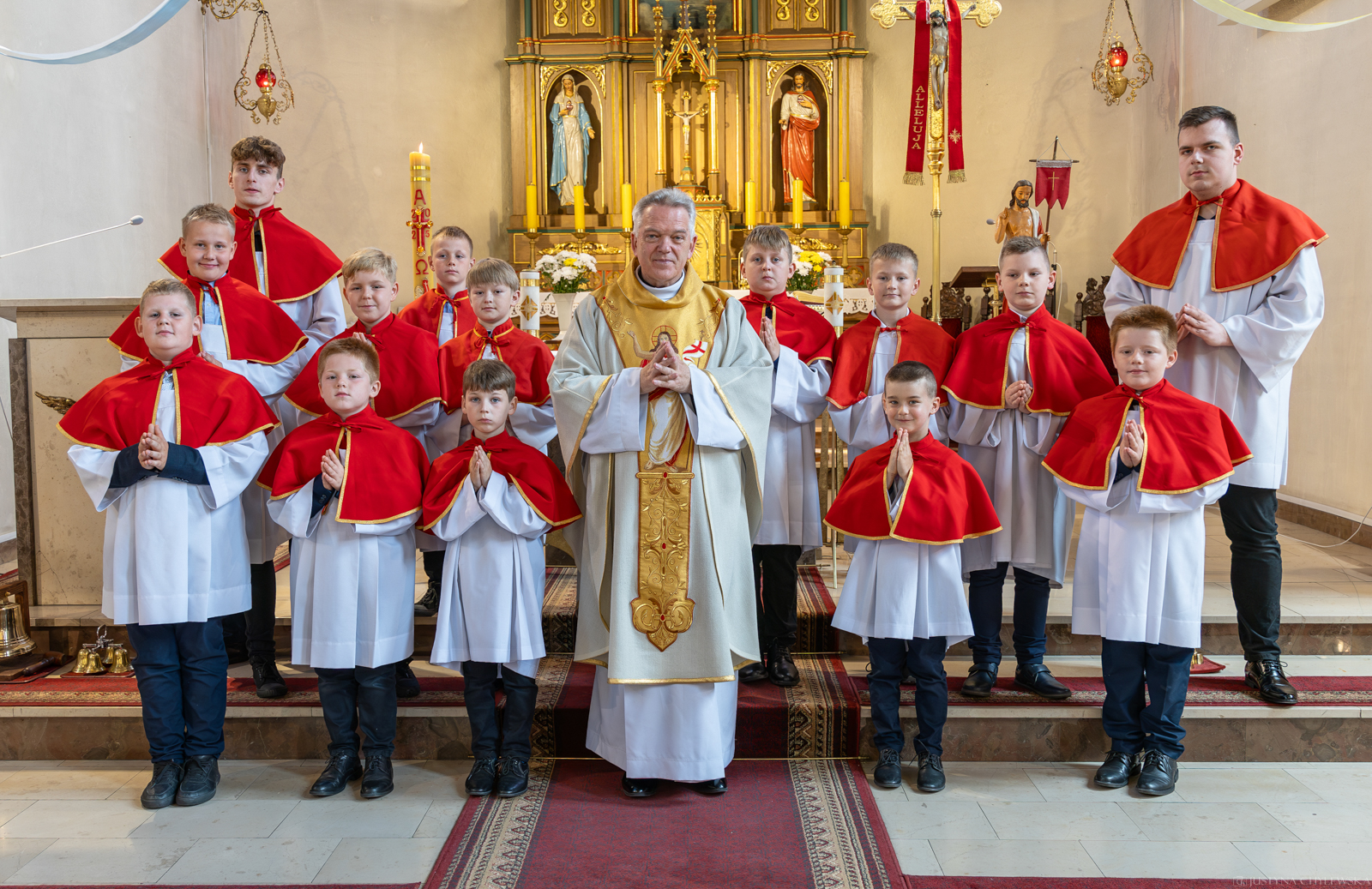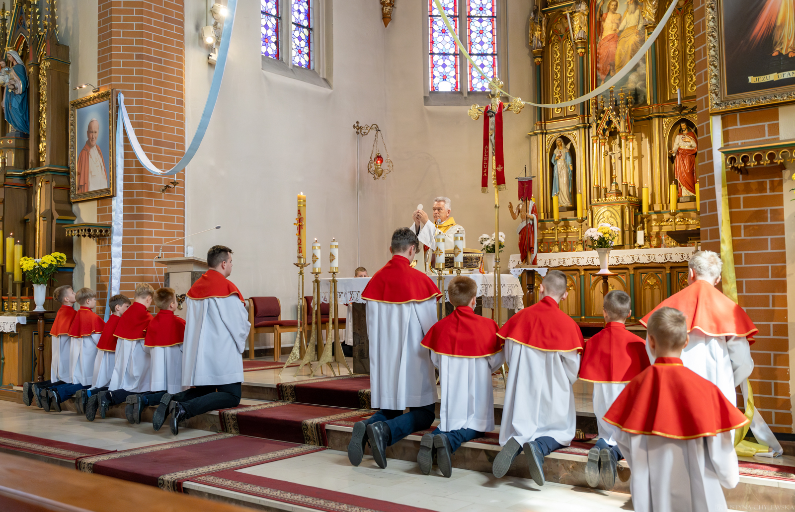 Podczas Mszy św. w niedzielę 1 czerwca 2025 r. o godz. 11:30 do naszej parafialnej Liturgicznej Służby Ołtarza oficjalnie zostali włączeni nowi ministranci: Mikołaj, Oskar, Franek, Piotr, Alan, Miłosz, Franek i Adam. W tę zaszczytną posługę przygotowywani byli przez ostatni rok formacji i asyst przy Ołtarzu. W obecności Księdza Proboszcza Henryka Fetke złożyli uroczyste przyrzeczenie sumiennego wykonywania obowiązków ministranta: pobożnie, gorliwie i radośnie na chwałę Bożą, i dla dobra wspólnoty parafialnej. Serdecznie im oraz rodzicom gratulujemy decyzji i życzymy wielu łask Bożych.