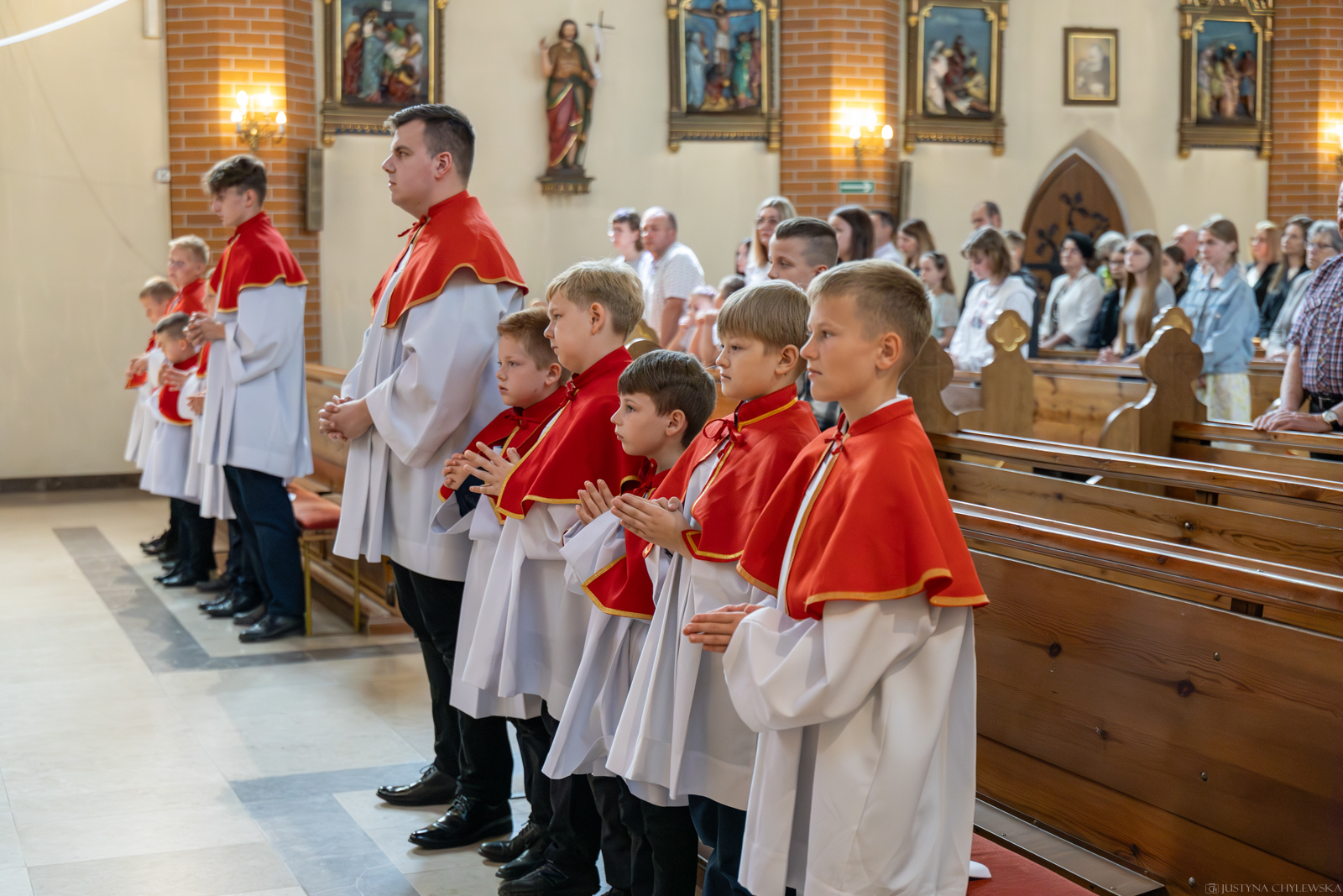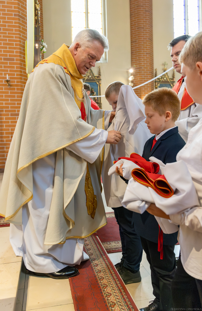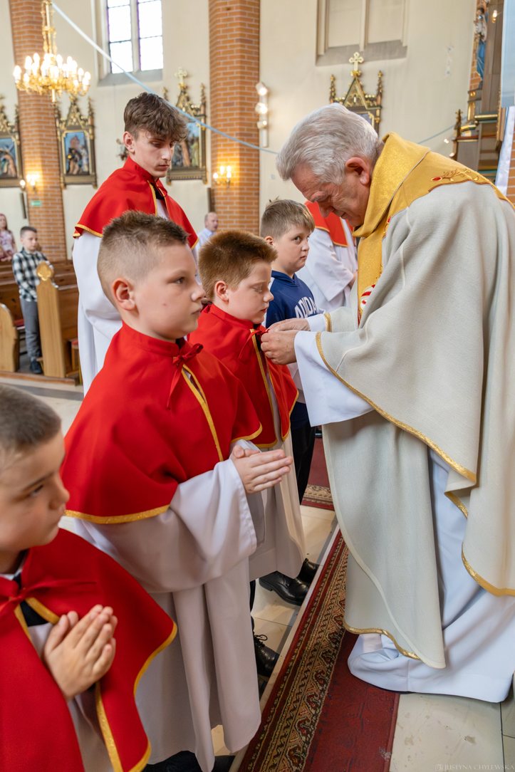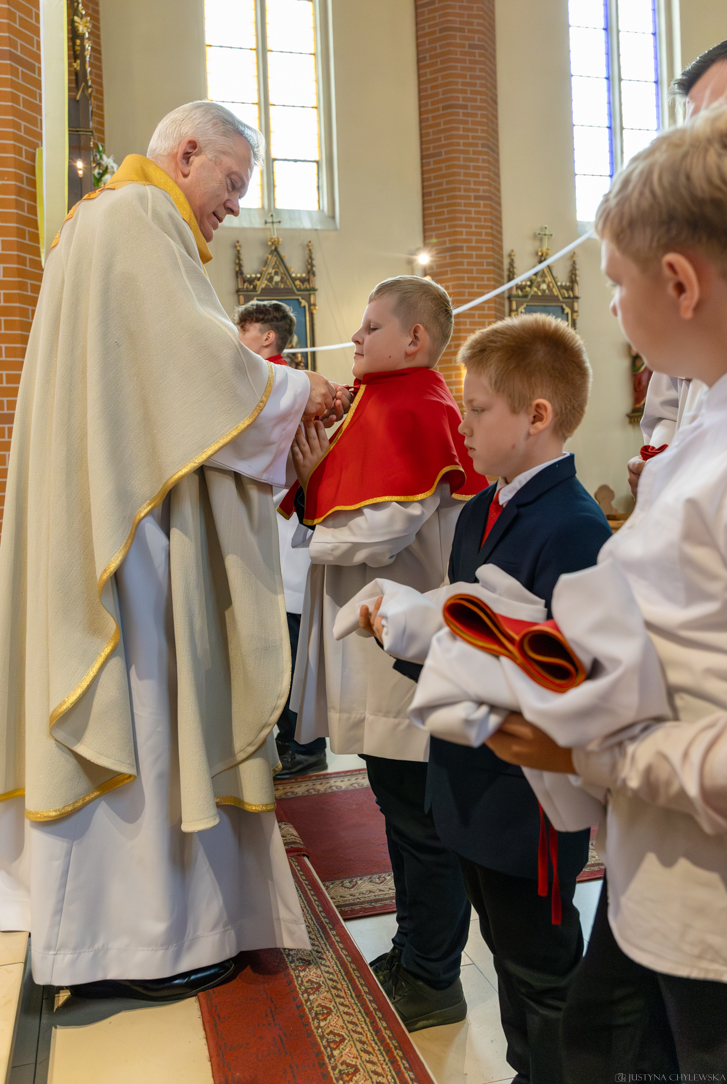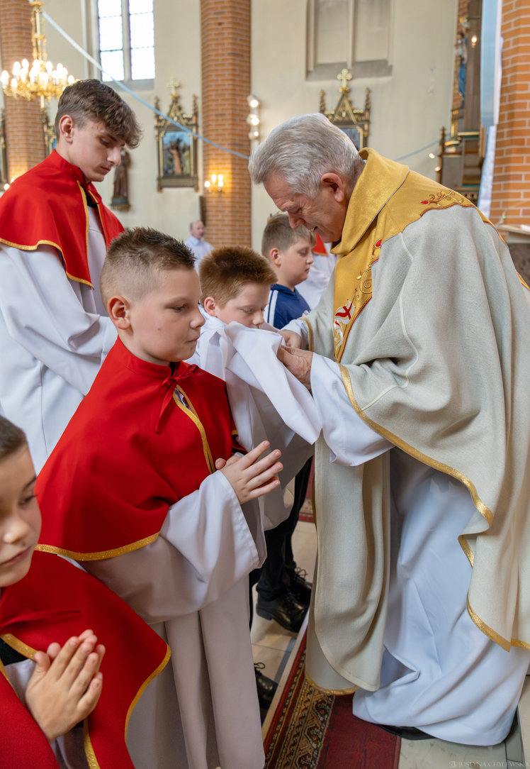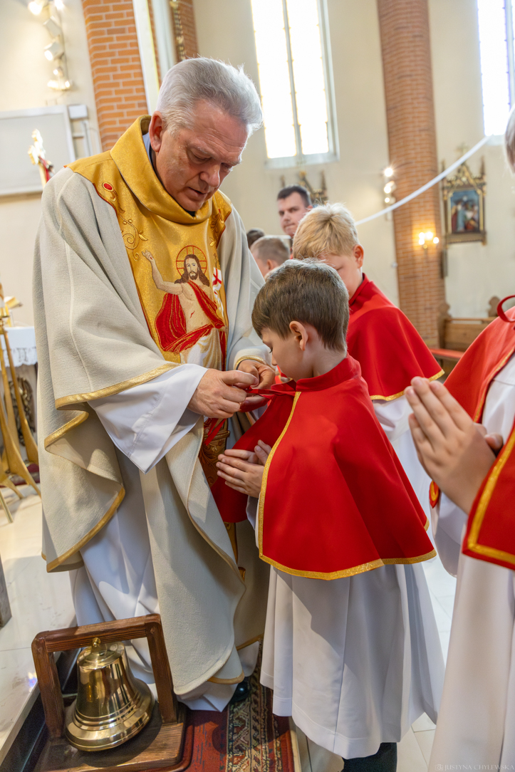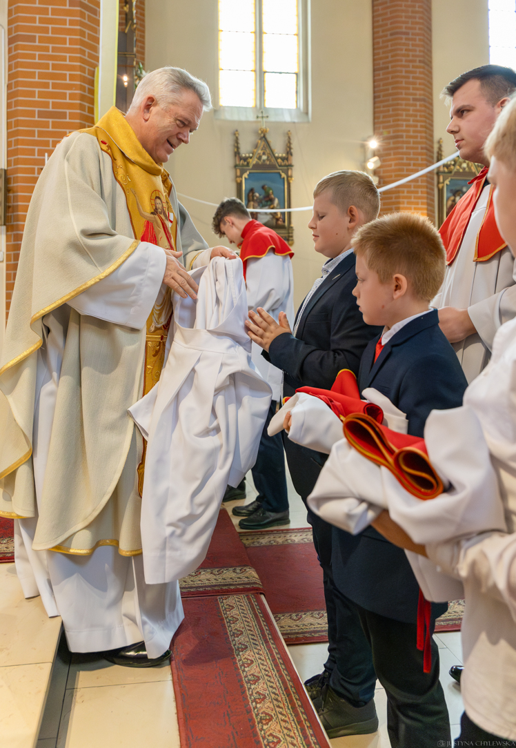 Podczas Mszy św. w niedzielę 1 czerwca 2025 r. o godz. 11:30 do naszej parafialnej Liturgicznej Służby Ołtarza oficjalnie zostali włączeni nowi ministranci: Mikołaj, Oskar, Franek, Piotr, Alan, Miłosz, Franek i Adam. W tę zaszczytną posługę przygotowywani byli przez ostatni rok formacji i asyst przy Ołtarzu. W obecności Księdza Proboszcza Henryka Fetke złożyli uroczyste przyrzeczenie sumiennego wykonywania obowiązków ministranta: pobożnie, gorliwie i radośnie na chwałę Bożą, i dla dobra wspólnoty parafialnej. Serdecznie im oraz rodzicom gratulujemy decyzji i życzymy wielu łask Bożych.