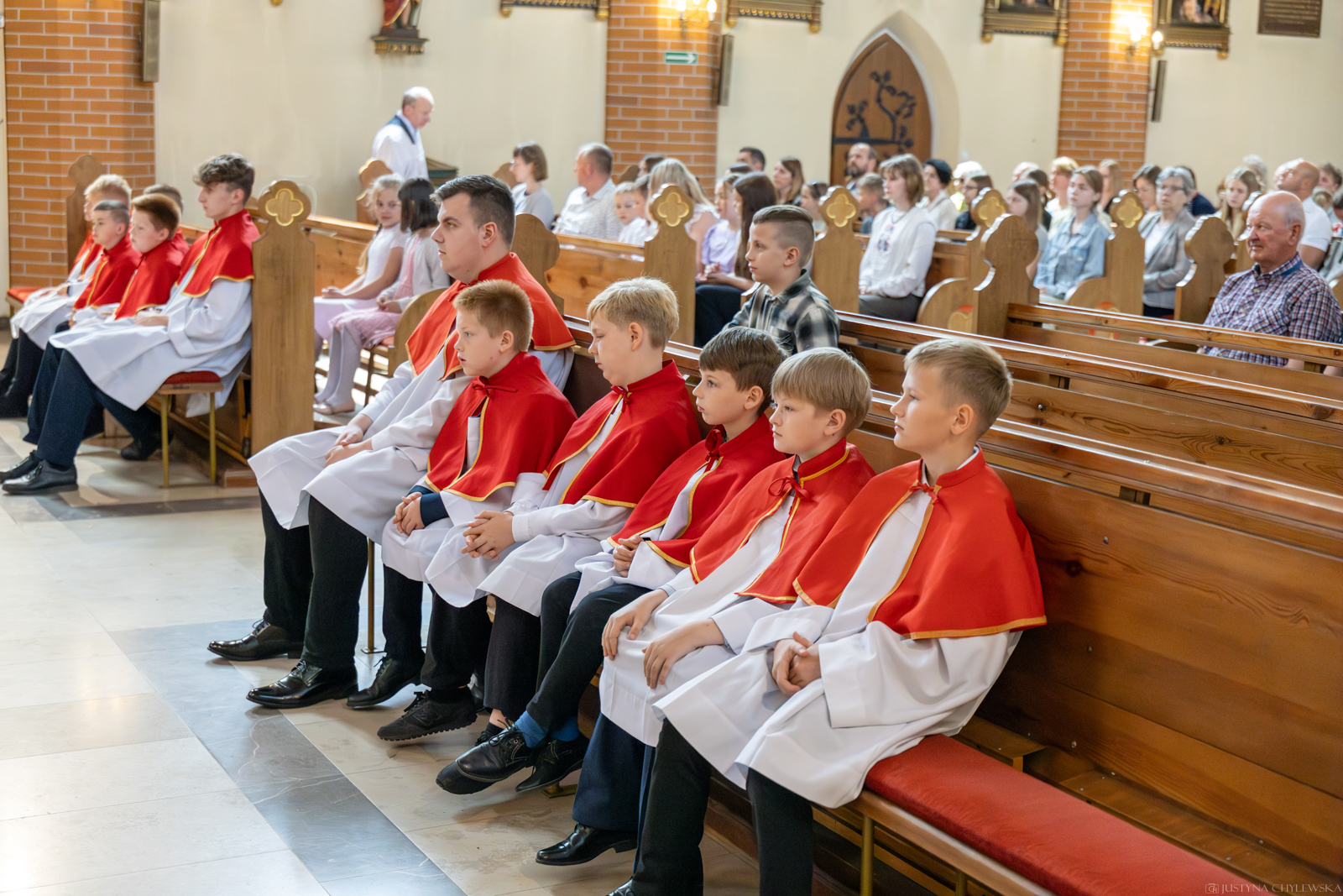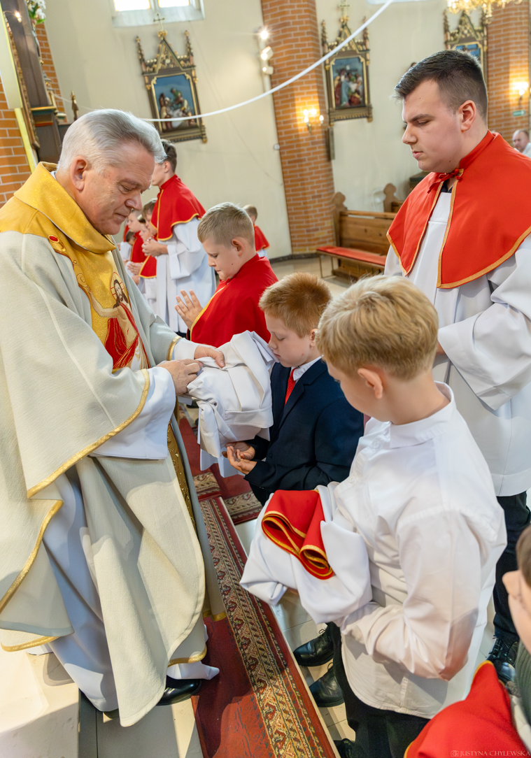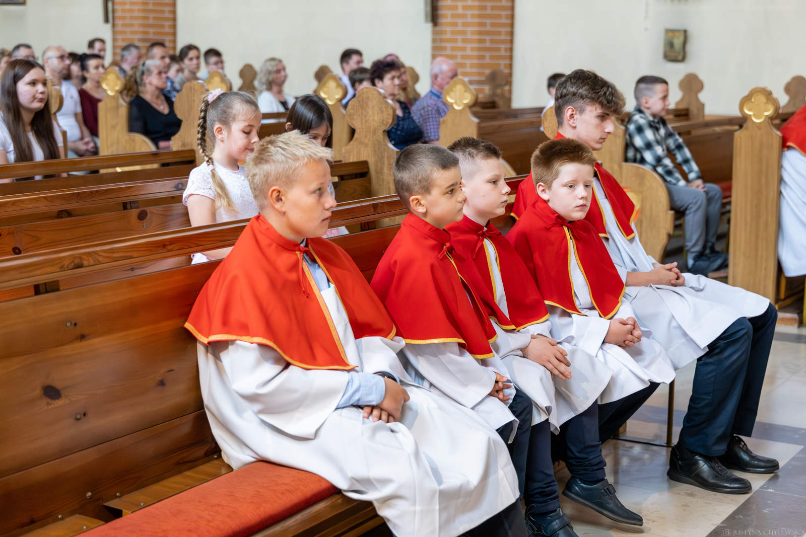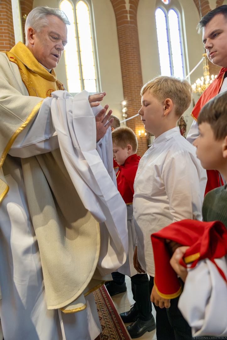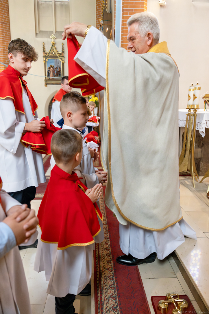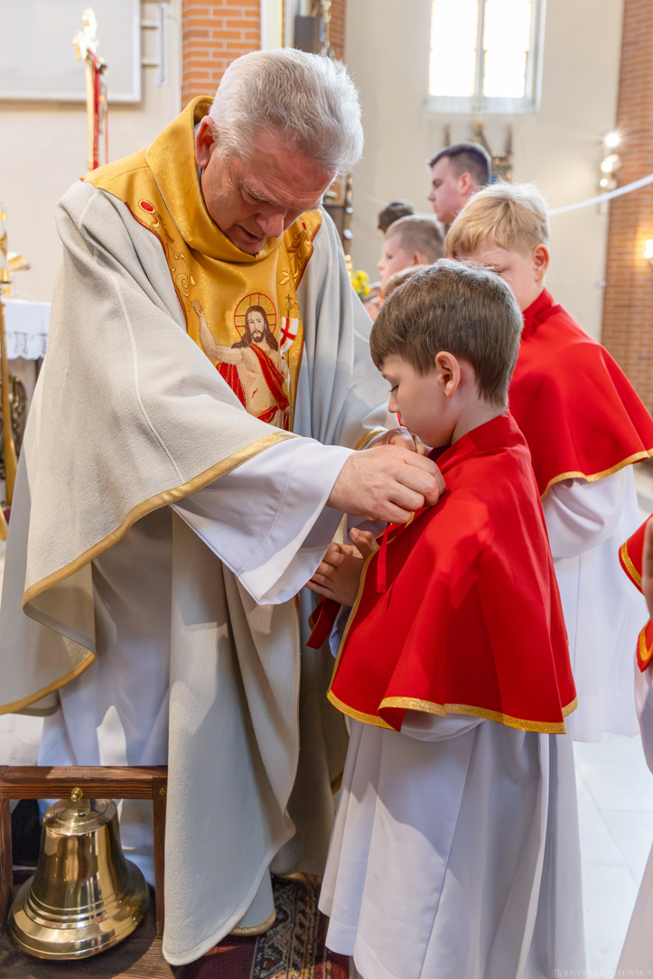 Podczas Mszy św. w niedzielę 1 czerwca 2025 r. o godz. 11:30 do naszej parafialnej Liturgicznej Służby Ołtarza oficjalnie zostali włączeni nowi ministranci: Mikołaj, Oskar, Franek, Piotr, Alan, Miłosz, Franek i Adam. W tę zaszczytną posługę przygotowywani byli przez ostatni rok formacji i asyst przy Ołtarzu. W obecności Księdza Proboszcza Henryka Fetke złożyli uroczyste przyrzeczenie sumiennego wykonywania obowiązków ministranta: pobożnie, gorliwie i radośnie na chwałę Bożą, i dla dobra wspólnoty parafialnej. Serdecznie im oraz rodzicom gratulujemy decyzji i życzymy wielu łask Bożych.