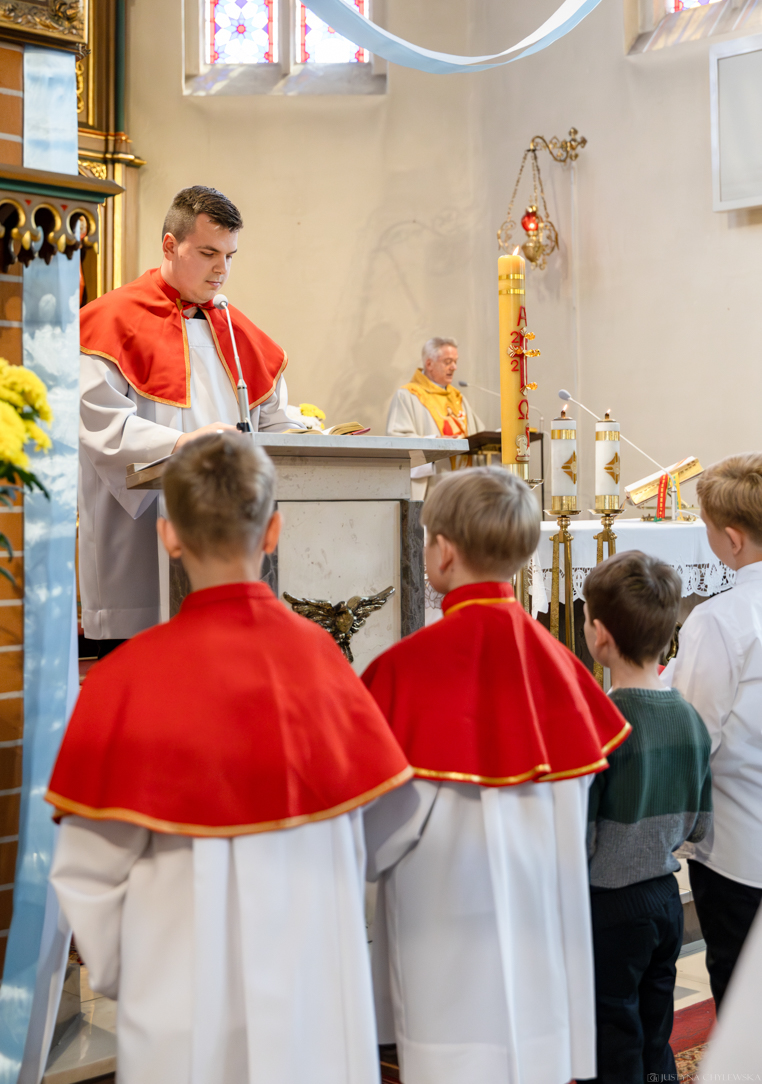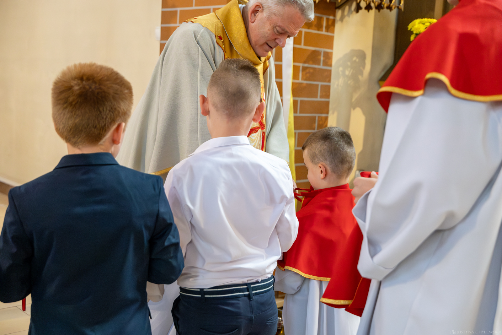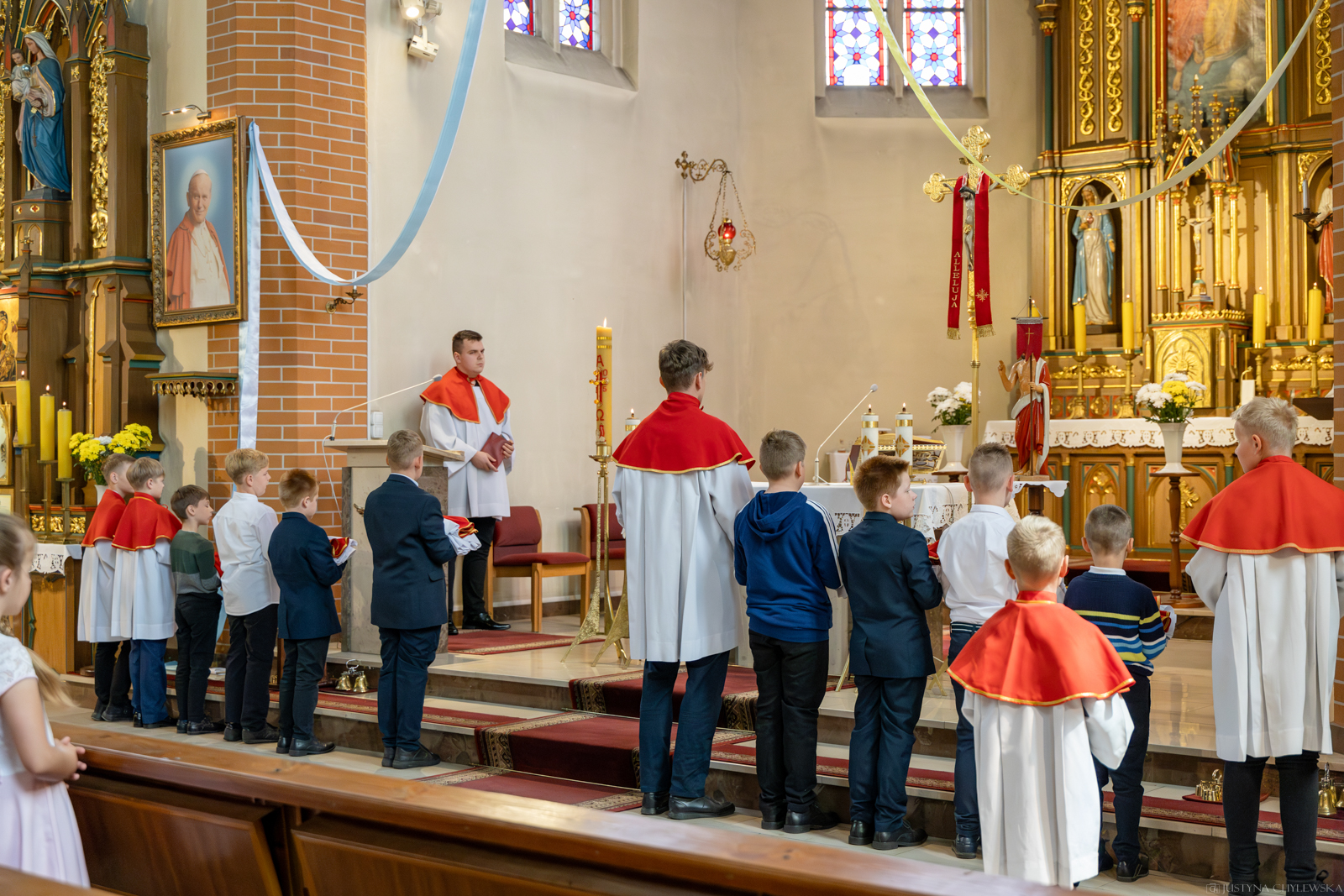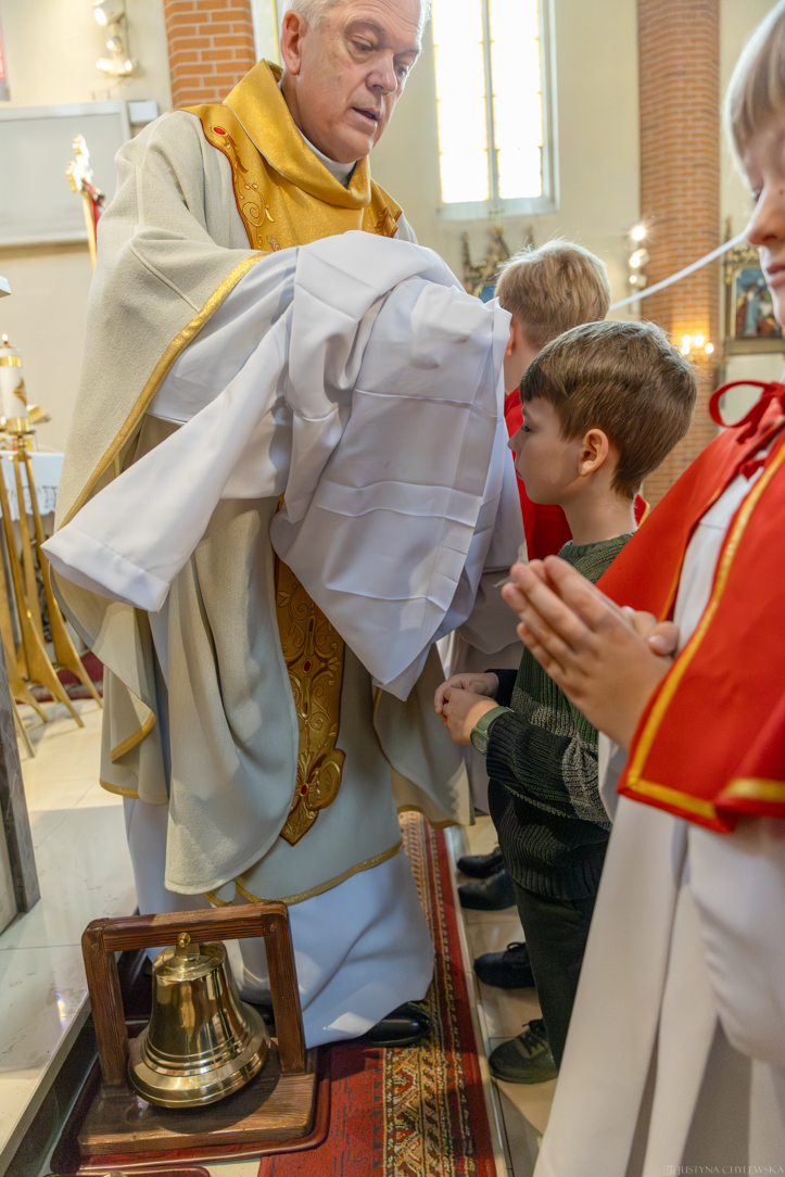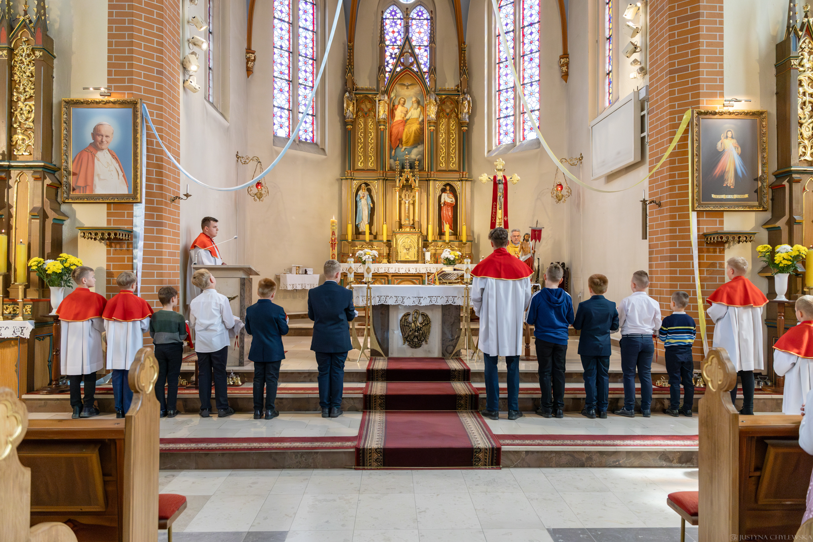 Podczas Mszy św. w niedzielę 1 czerwca 2025 r. o godz. 11:30 do naszej parafialnej Liturgicznej Służby Ołtarza oficjalnie zostali włączeni nowi ministranci: Mikołaj, Oskar, Franek, Piotr, Alan, Miłosz, Franek i Adam. W tę zaszczytną posługę przygotowywani byli przez ostatni rok formacji i asyst przy Ołtarzu. W obecności Księdza Proboszcza Henryka Fetke złożyli uroczyste przyrzeczenie sumiennego wykonywania obowiązków ministranta: pobożnie, gorliwie i radośnie na chwałę Bożą, i dla dobra wspólnoty parafialnej. Serdecznie im oraz rodzicom gratulujemy decyzji i życzymy wielu łask Bożych.