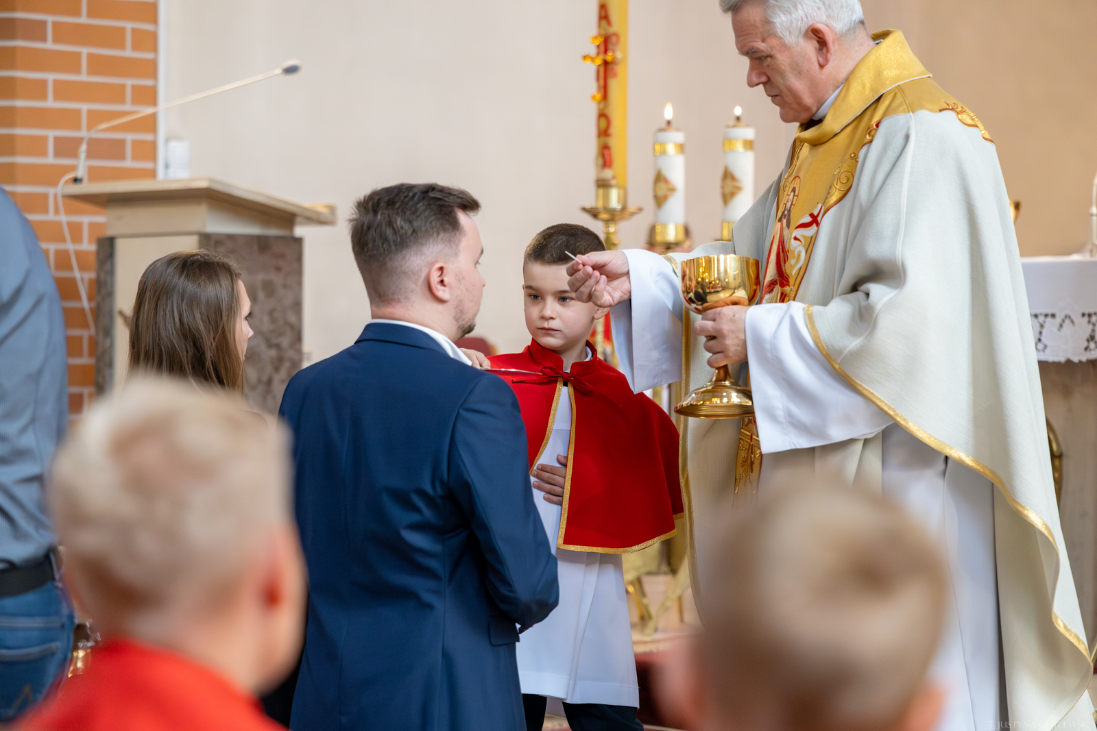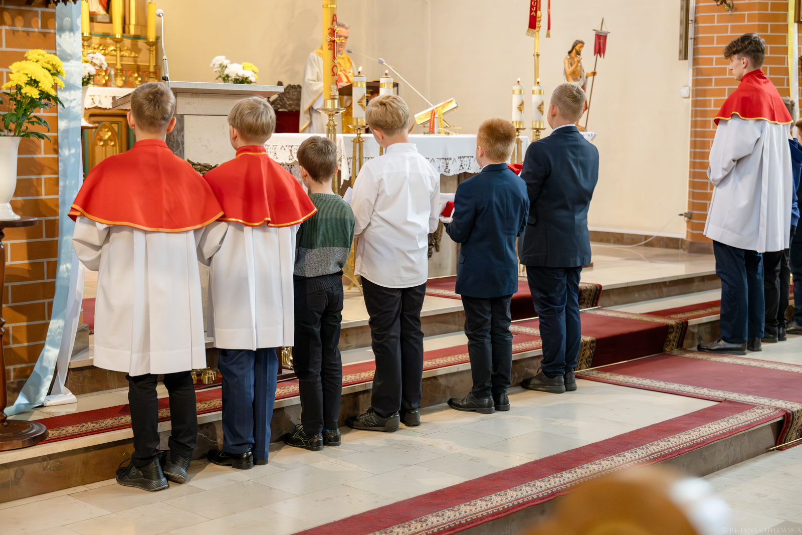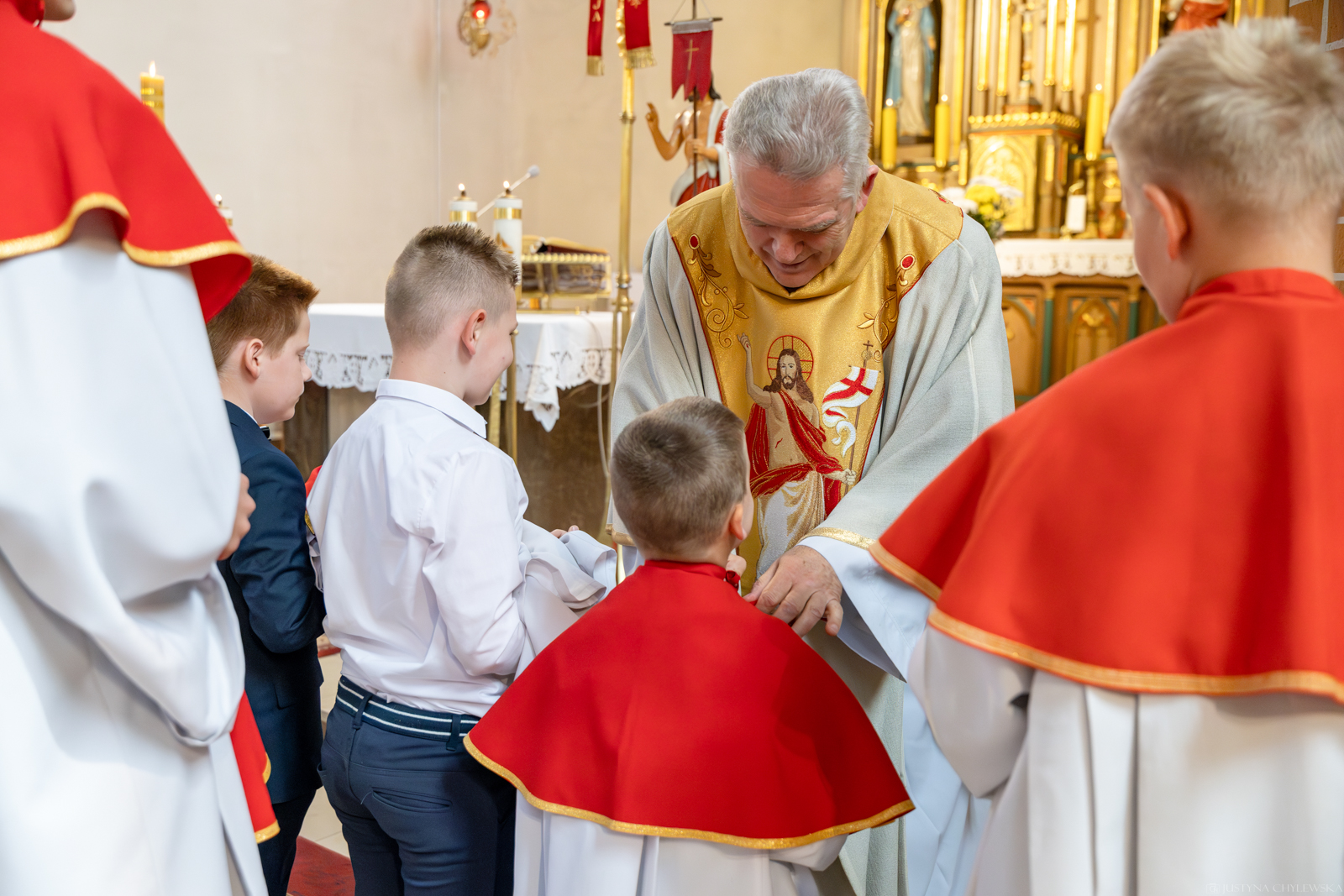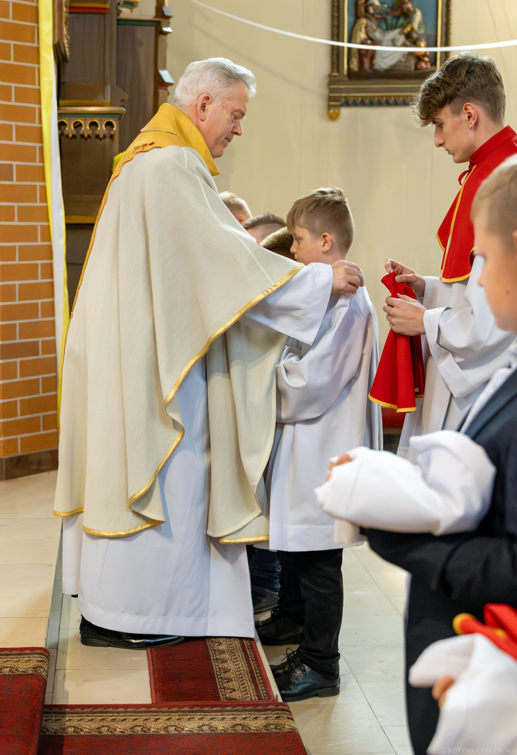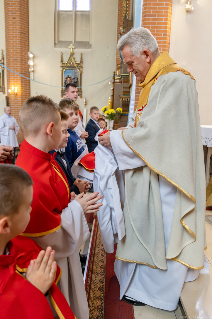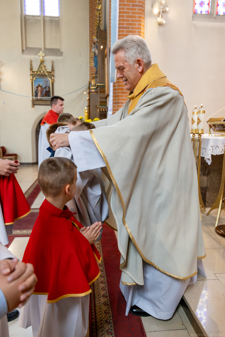 Podczas Mszy św. w niedzielę 1 czerwca 2025 r. o godz. 11:30 do naszej parafialnej Liturgicznej Służby Ołtarza oficjalnie zostali włączeni nowi ministranci: Mikołaj, Oskar, Franek, Piotr, Alan, Miłosz, Franek i Adam. W tę zaszczytną posługę przygotowywani byli przez ostatni rok formacji i asyst przy Ołtarzu. W obecności Księdza Proboszcza Henryka Fetke złożyli uroczyste przyrzeczenie sumiennego wykonywania obowiązków ministranta: pobożnie, gorliwie i radośnie na chwałę Bożą, i dla dobra wspólnoty parafialnej. Serdecznie im oraz rodzicom gratulujemy decyzji i życzymy wielu łask Bożych.