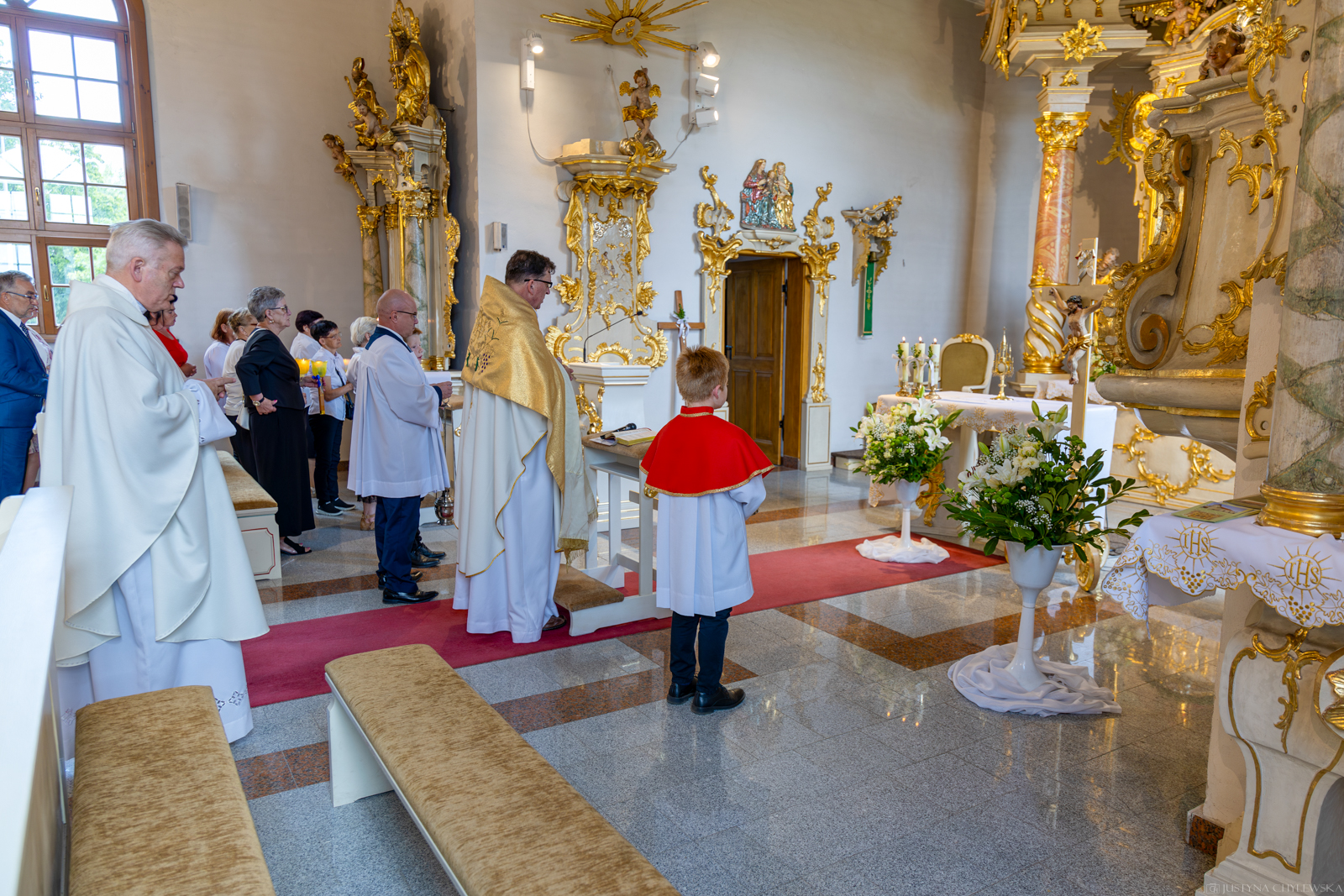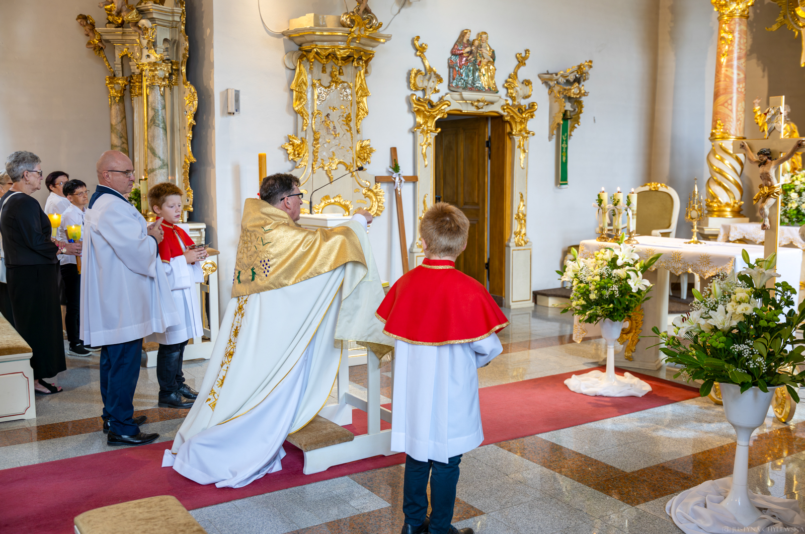 Pierwsza Komunia Święta jest doniosłą chwilą na drodze duchowego rozwoju dzieci, po raz pierwszy jednoczą się z Panem Bogiem. W niedzielę - 11 maja 2025 r. do Sakramentu Eucharystii przystąpiło w naszej parafii 24 dzieci klas trzecich szkół podstawowych. Do tej ważnej chwili przygotowywały Panie Katechetki: Lucyna Kamieniarz i Aurelia Kowalik oraz Ksiądz Proboszcz Henryk Fetke. Msza św. z uroczystą oprawą liturgiczną, w którą zaangażowane były dzieci pierwszokomunijne i piękny wystrój kościoła, na długo pozostanie w pamięci. Ksiądz Proboszcz podziękował rodzicom za złożoną ofiarę, która została przeznaczona na zakupienie nowych mikrofonów do kościoła parafialnego. Po I Komunii św. rozpoczął się biały tydzień, podczas którego dzieci uczestniczyły każdego dnia we mszy św. i nabożeństwie majowym oraz złożyły ofiary dla dzieci w rejonach misyjnych na całym świecie.